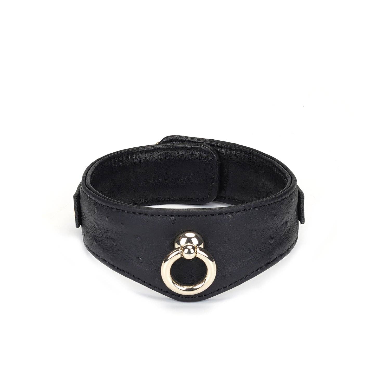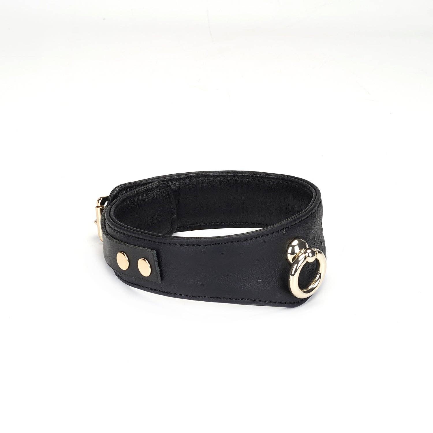 Restraint your partner with this luxurious ostrich skin pattern leather cuff A big O-rings attached, enjoy various plays by connecting freely Shining gold metal lights up the entire cuff Locking buckle straps for a perfect fit