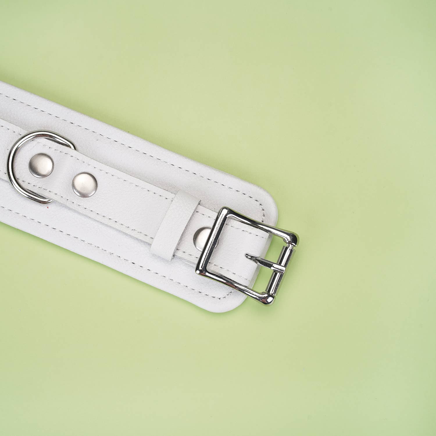Made from genuine soft touch aromatic leather these cuffs are sturdy and especially elegant in this color combination. White leather straps on brilliant white leather cuffs with gold metal hardware look sexy and sophisticated. The leather is very soft so while they are tough they leave nothing to be desired comfort wise. Included in the set is a leather strap with quick release clips on both ends so that you can securely restrain your sub with ease.