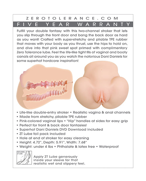 Fulfill your double fantasy with this two-channel stroker that lets you slip through the front door and bang the back door as hard as you want! Crafted with super-stretchy and pliable TPE rubber that moves with your body as you thrust, use the hips to hold on, and dive into that pink sweet spot primed with complimentary ZT lube. Feel the life-like tight fits of vaginal and booty canals all around you as you watch the notorious Dani Daniels for some superhot hardcore inspiration!